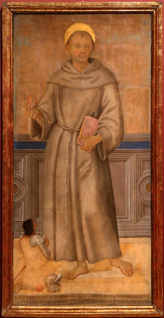 St. Anthony of Padua and patrons is painted in tempera on canvas (143 x 68 cm) and shows the Saint standing with his attributes of a book and a flame, against the background of a parapet with a soldier at his feet. An inscription at the bottom reads: BOLO DE MARAGLIA DA PEROGA. QUANDO FO PREGIONE DE FRANCIOSE / CHE FO ADDI XI DE FEBRAIO MDXII PETRUS PINXIT DE CASTRO PLEBLIS. The inscription indicates that this is an ex-voto of Bartolomeo da Maraglia, a condottiere of the Baglioni family. The work, characteristic of the painter's late maturity (1512), is executed in warm, light colours, with soft drawing and good proportions, and presents a compositional scheme repeated in other works by the Umbrian master, such as the Blessed Giacomo della Marca in the National Gallery of Umbria.