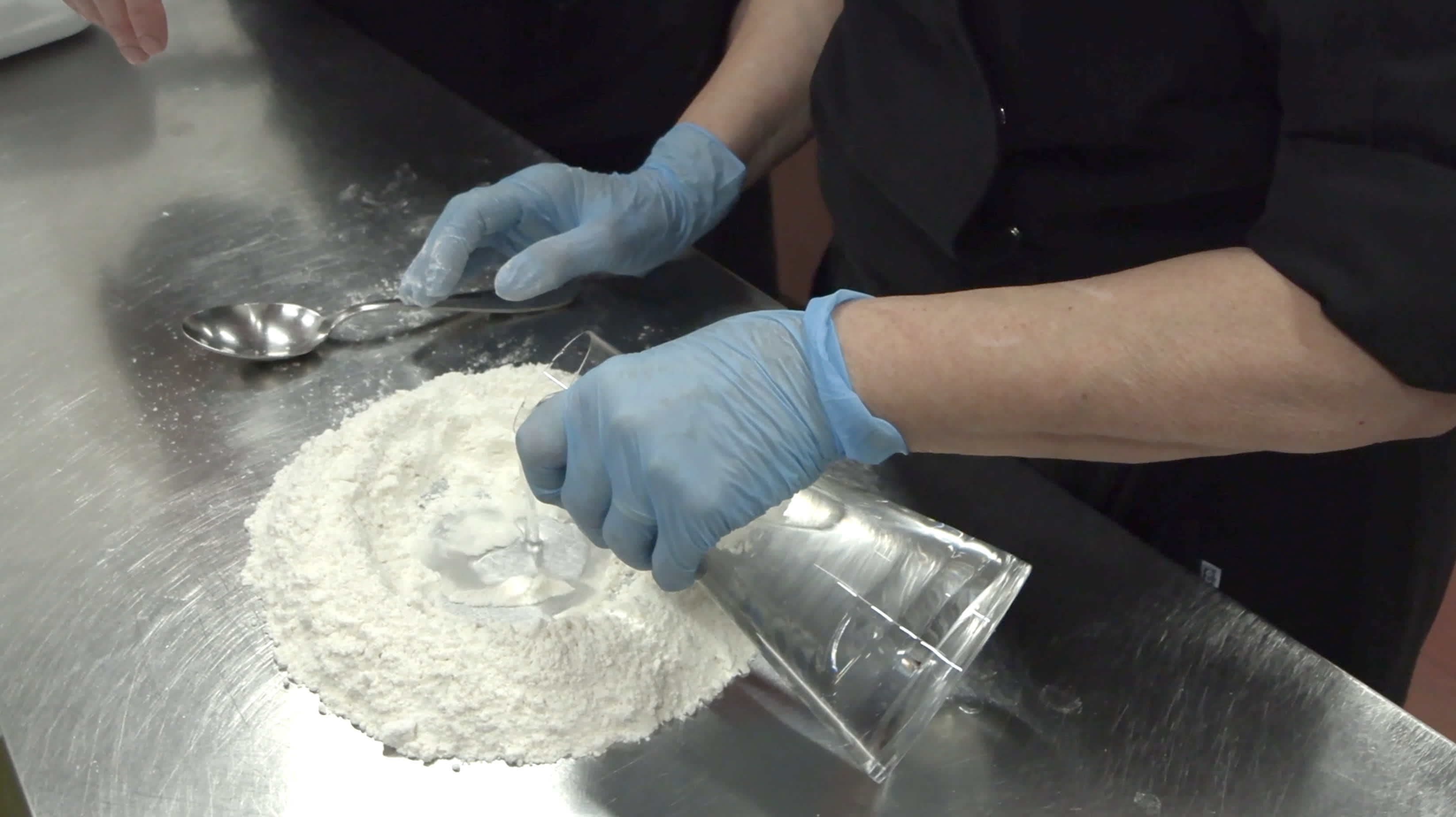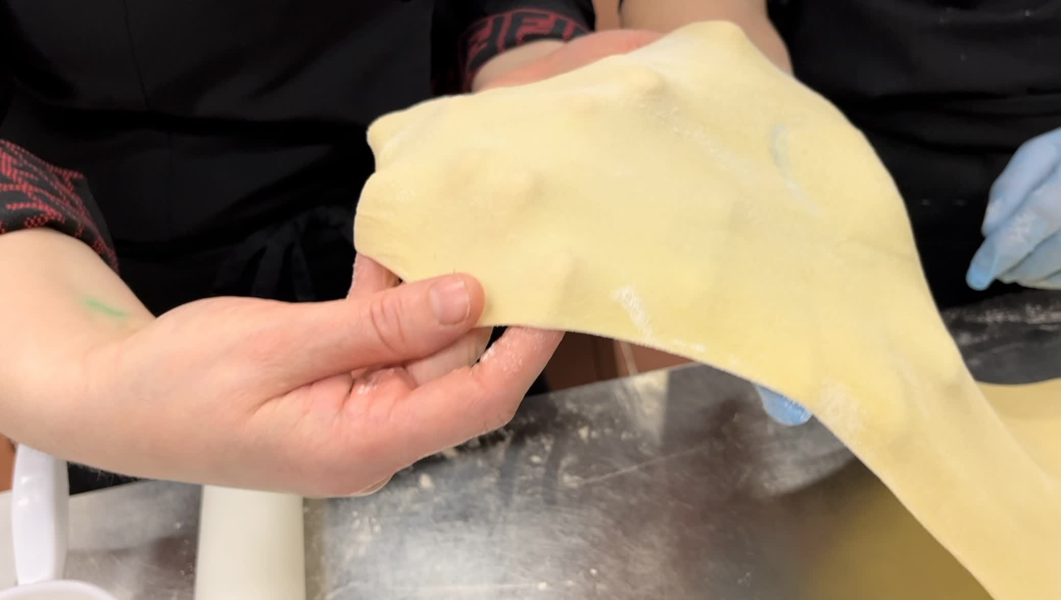 Make a well in the flour and add the water and oil a little at a time to give the dough elasticity. Roll out the dough with a rolling pin until it is very thin and elongated.
