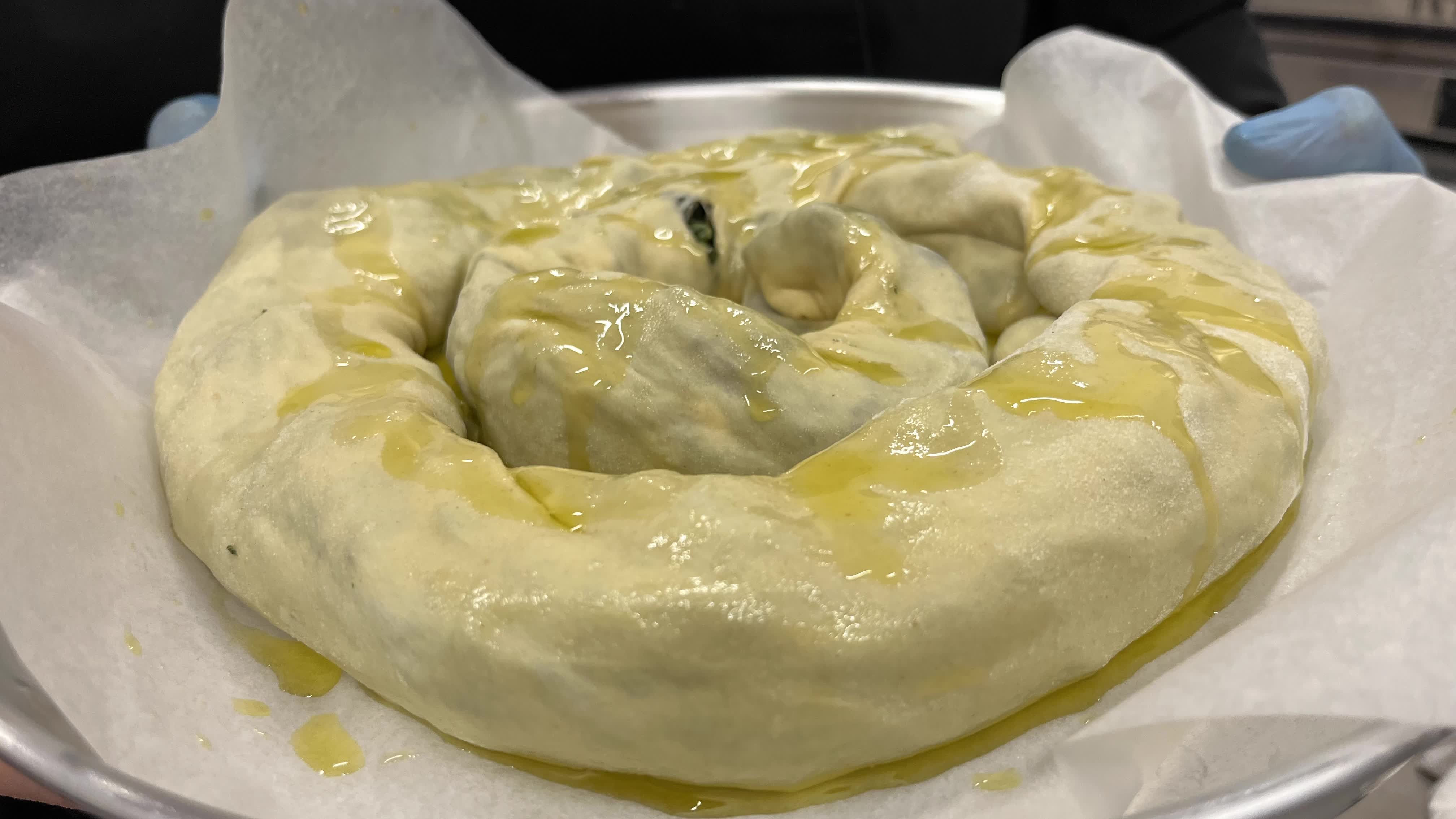 Roll up the pastry, giving it a spiral shape and finally brush with olive oil and bake in a static oven at 165 degrees for about 30 minutes.