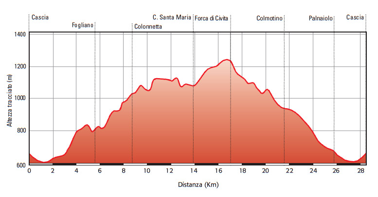 The route, which begins a few meters outside the center of Cascia can be divided into two parts: the first, which is nearly all uphill, goes to Forca di Civita (km 18,5); the second, entirely downhill, returns to the starting point. The total distance of 30 kilometres and the length of the climb (which has some very hard stretches) make the route difficult and therefore suitable only for really fit bikers. If some don’t mind walking, however, even less fit bikers can cover the route: the views they will discover will fully repay them for their efforts.