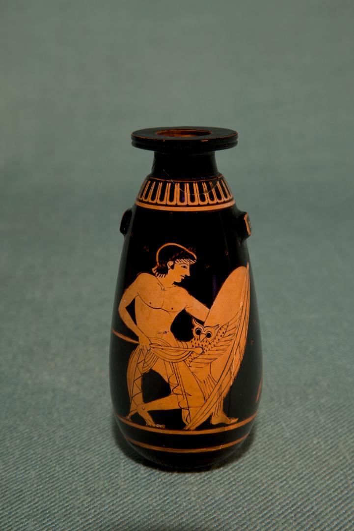 Among them is an antique Attic alabastron, a particular vase for holding perfumed oils decorated with a red pattern by the Painter of the Foundry, dated in the 5th century B.C.