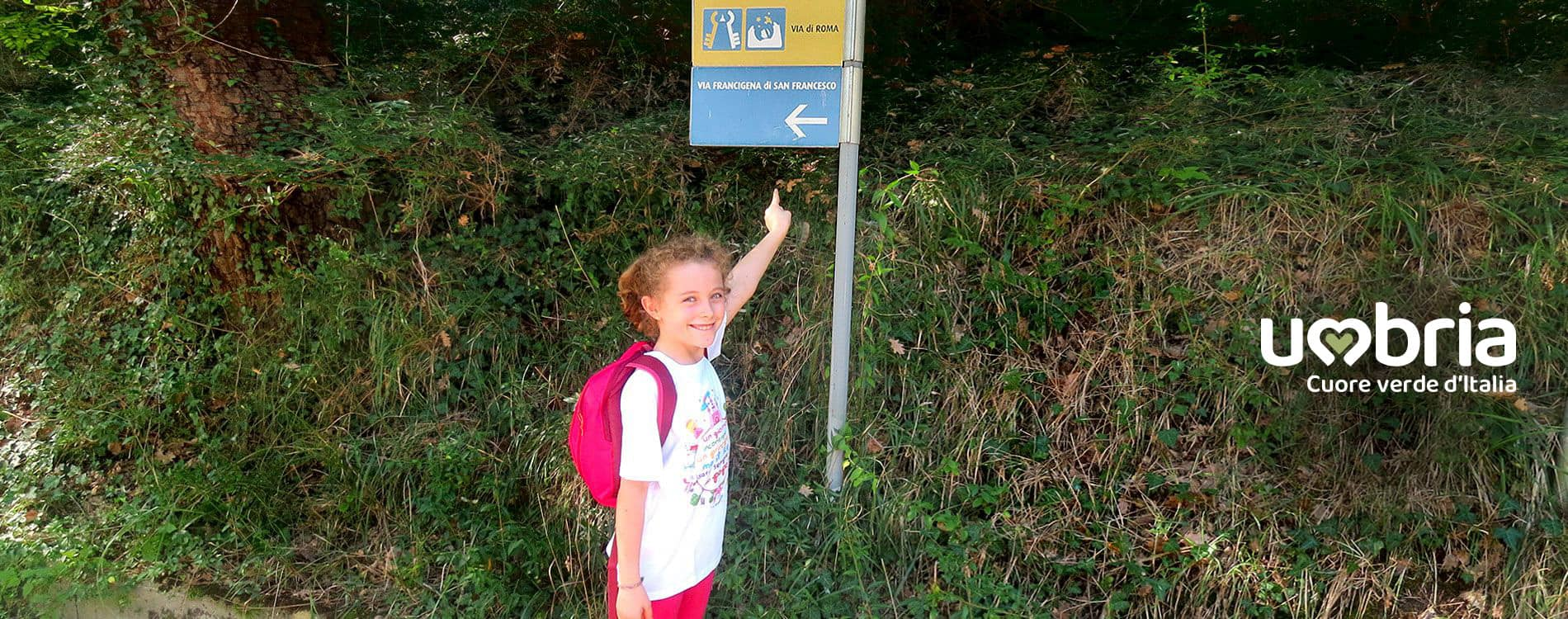 In Umbria appaiono i segnavia giallo-blu e il Tau giallo, posizionati con attenzione alla bidirezionalità del percorso, e le paline con cartelli del medesimo colore.